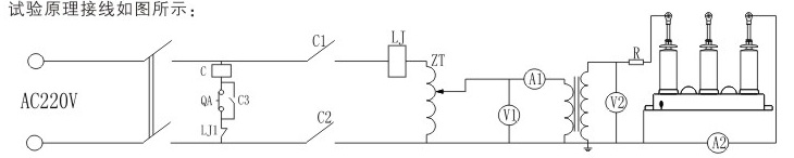 按原理圖將相關(guān)儀表和設(shè)備連接好。測試前應(yīng)首先將電流繼電器LJ的整定值調(diào)至最小值(作為后備保護),然后將試驗變壓器空載升壓,電流繼電器LJ應(yīng)不動作,將數(shù)字電流表A1的雖程調(diào)至5?20A(5KVA及以下容里試驗變壓器可不加限流電阻Rl。