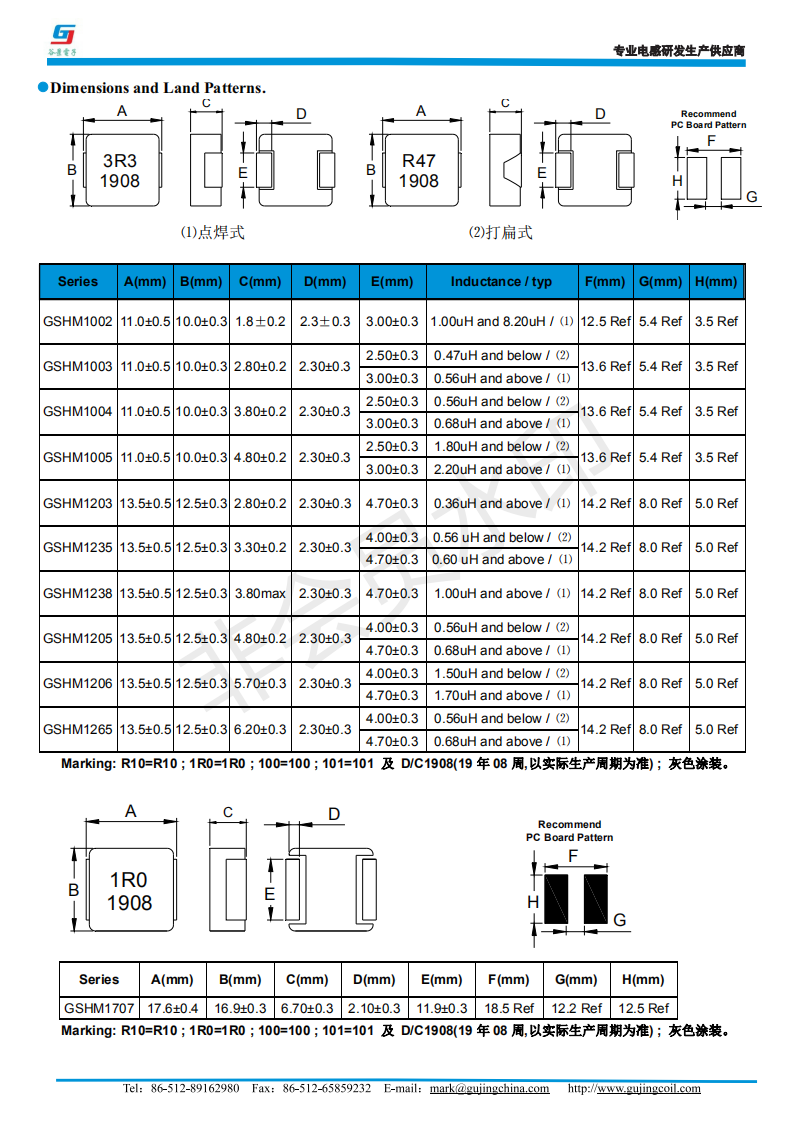 谷景GSHM一體成型電感的型號(hào)有:03系列尺寸為3.5*3.2*1.8、04系列尺寸為4.45*4.06*1.8、05系列尺寸為:5.70*5.20*2.80、06系列的尺寸為:7.30*6.60*4.8、10系列的尺寸為11*10*4.8、12系列的尺寸為:13.5*12.5*6.2。尺寸齊全,適合各種不同的電路。